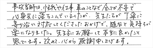 事故当時は、怪我や仕事、車のことなど全てが不安で心身共に落ちこんでいましたが、先生たちが丁寧に寄り添い対応してくださったおかげで、随分と気持ちが楽になりました。先生方にお願いして本当に良かったと思っています。改めて、心から感謝申し上げます。