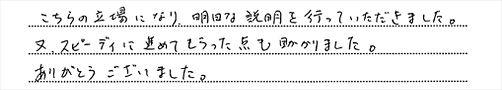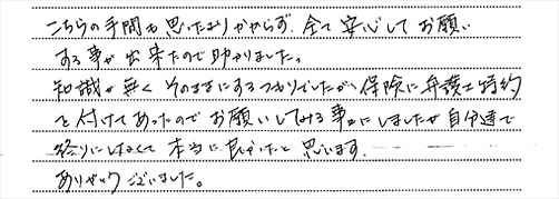 何の知識もなく、不安でしたが、丁寧な説明と、迅速な対応をして頂き、無事終える事が出来ました。