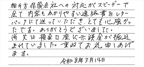 相手方保険会社への対応がスピーデーで全て内容も分かりやすい連絡書をレターパックにて送っていただき、とても心強かったです。ありがとうございました。
