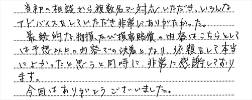 当初の相談から複数名で対応いただき、いろんなアドバイスをしていただき非常にありがたかった。最終的な物損及び損害賠償の内容はこちらとしては予想以上の内容での決着となり、依頼をして本当によかったと思うと同時に、非常に感謝しております。