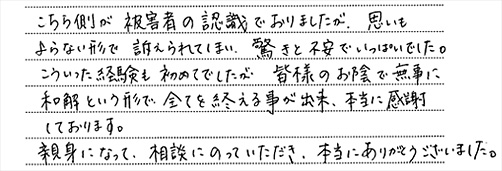 こういった経験も初めてでしたが、皆様のお陰で無事に和解という形で全てを終える事が出来、本当に感謝しております。